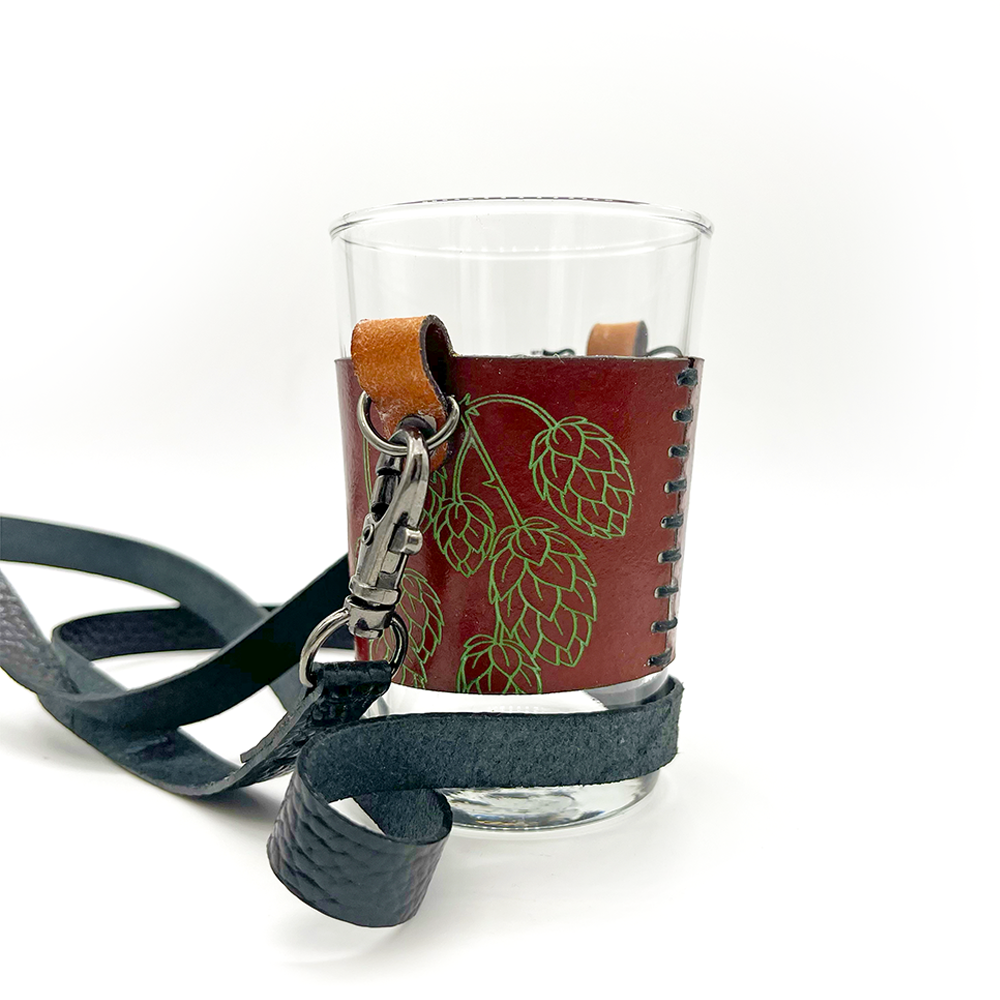 These lanyards are truly unique and made by hand. High quality leather is hand picked, individually hand stitched, laser engraved and the designs are color filled before getting a light coat of leather oil. The lanyards feature metal clasps making it easy to remove over hats and large beards. A 4 ounce tasting glass is INCLUDED.